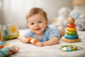 One of the earliest milestones is the social smile, usually appearing around 6 to 8 weeks. Babies begin responding to faces, voices, and gentle interaction. This moment is often when parents first notice their baby actively engaging with them.